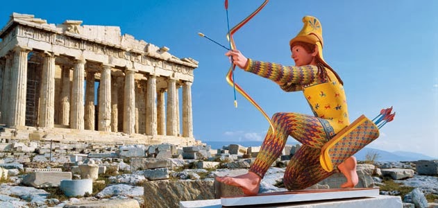 So entrenched has the association become between classical art and the look of white, unblemished marble, that the idea of an Athenian acropolis as colorfully painted as a circus wagon is difficult to imagine if not downright blasphemous.