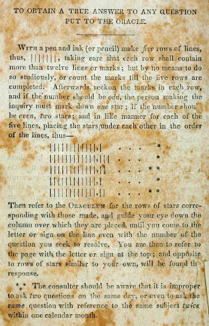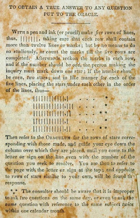 To foretell the future, the diviner first selects a question from the printed list. Then the diviner draws five rows of lines, “taking care that each row shall contain more than twelve lines or marks; but by no means to do so studiously, or count the marks till the five rows are completed.” The lines are counted, and for each row if the number is even the user draws two stars, if odd one star: