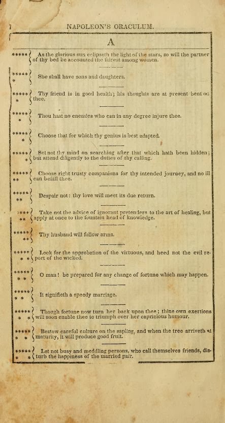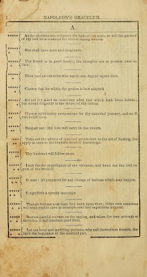 The true origin of the Oraculum is unclear. Reportedly there were English translations in the 1820s but the most widely sold version was Boney’s Oraculum, or Napoleon’s Book of Fate, published in Ireland by James Duffy and Sons in 1830.
