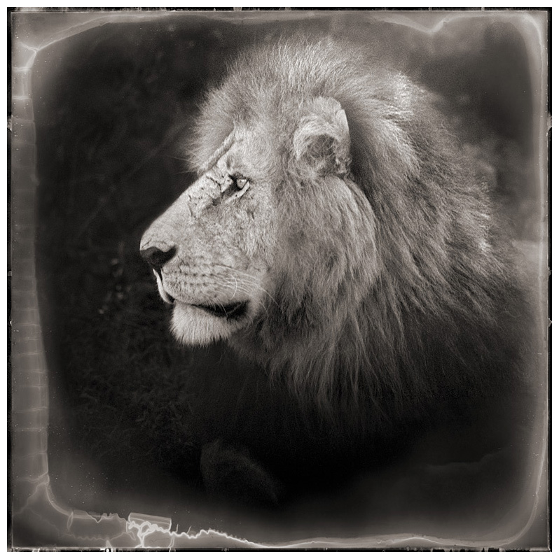 But there is also a strong sense of the plight of these animals. Dark clouds overhead suggest an ominous future. A strong wind on a lion's mane warns of the storm approaching. Animals trek across vast plains, like refugees from a disaster. Added to this, the edges of some pictures seem aged suggesting the animals are already extinct, already in the past.