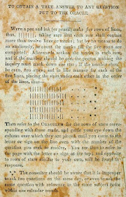 To foretell the future, the diviner first selects a question from the printed list. Then the diviner draws five rows of lines, “taking care that each row shall contain more than twelve lines or marks; but by no means to do so studiously, or count the marks till the five rows are completed.” The lines are counted, and for each row if the number is even the user draws two stars, if odd one star: