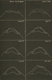 He rushed to the mountain to spend the night at the crater’s edge, and he returned over the following months to pass the night at the summit, watch the lava and record his observations. He compiled histories of past eruptions, collected mineral specimens and from his Villa Angelica in Portici drew the changes that day by day altered the summit’s silhouette.
